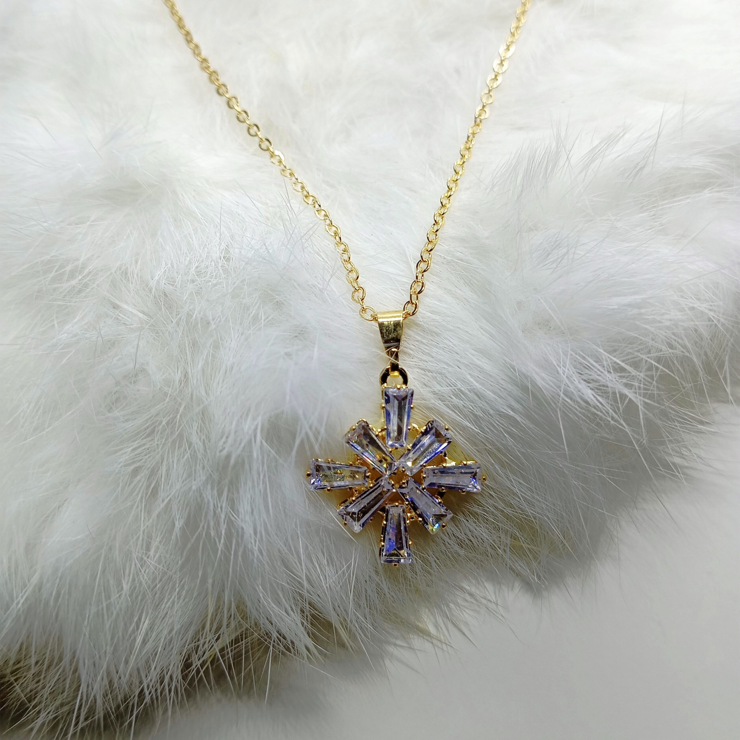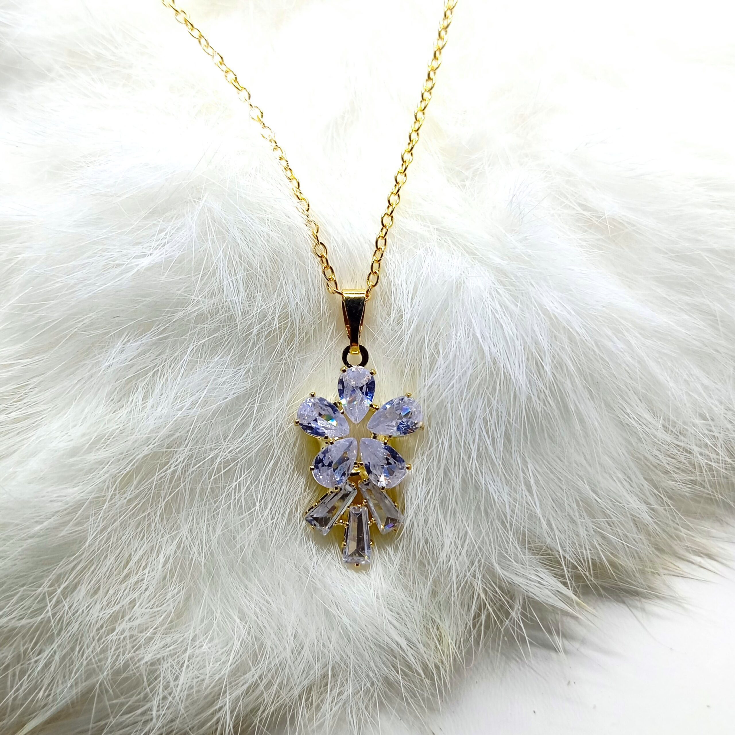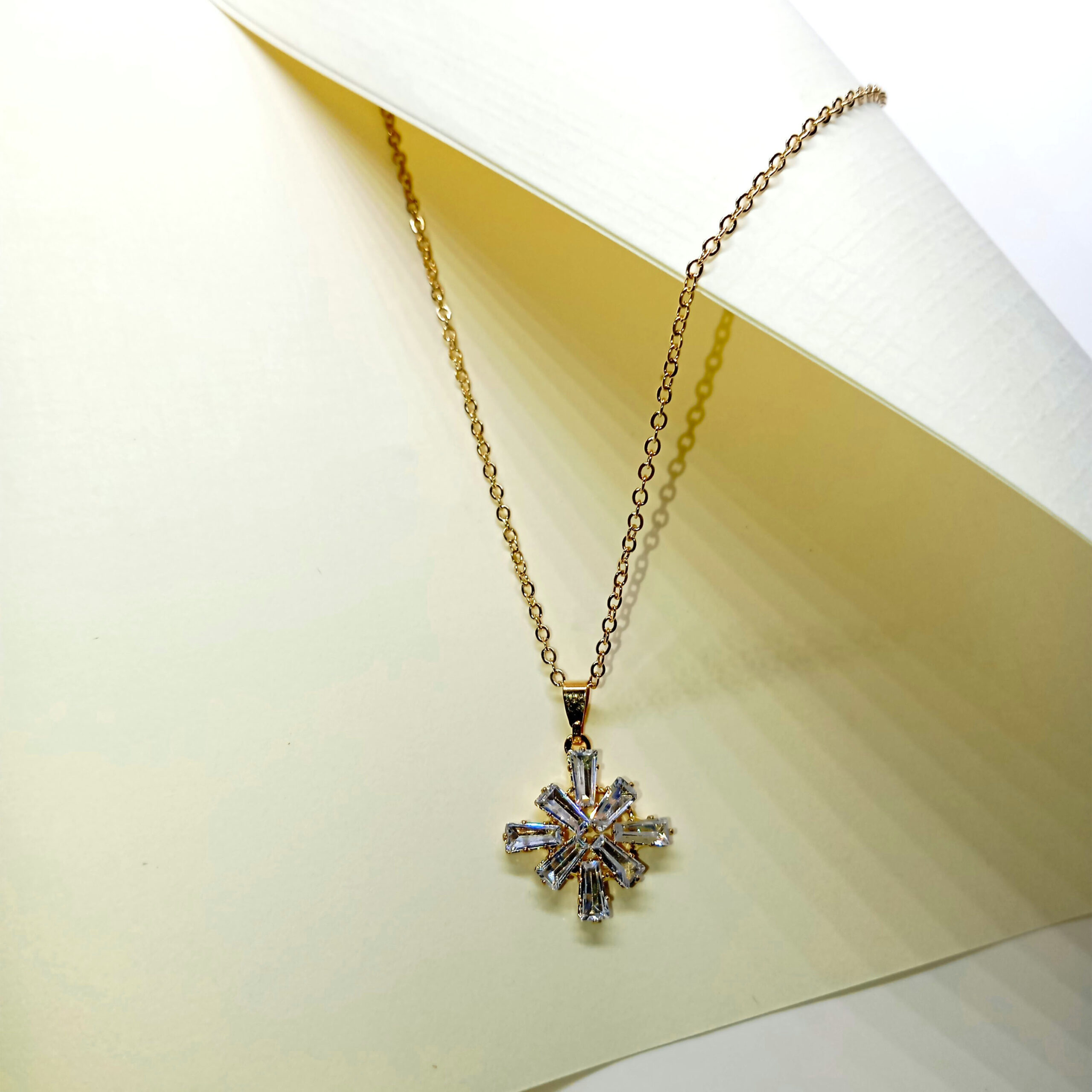 Elevate your style with this delicate gold necklace featuring a crystal flower pendant. The pendant showcases clear, baguette-cut crystals arranged in a blossom design, adding a touch of sparkle to any outfit.