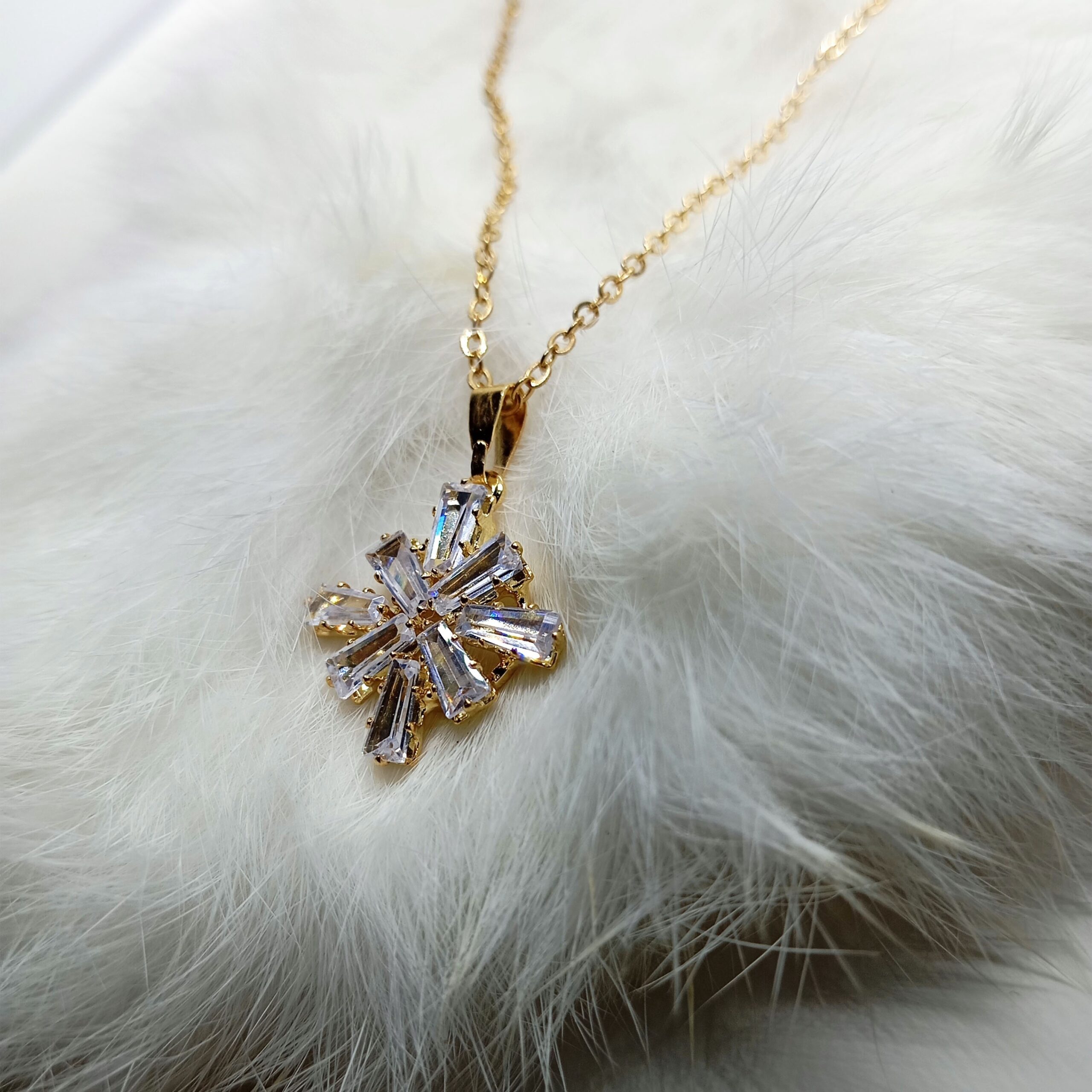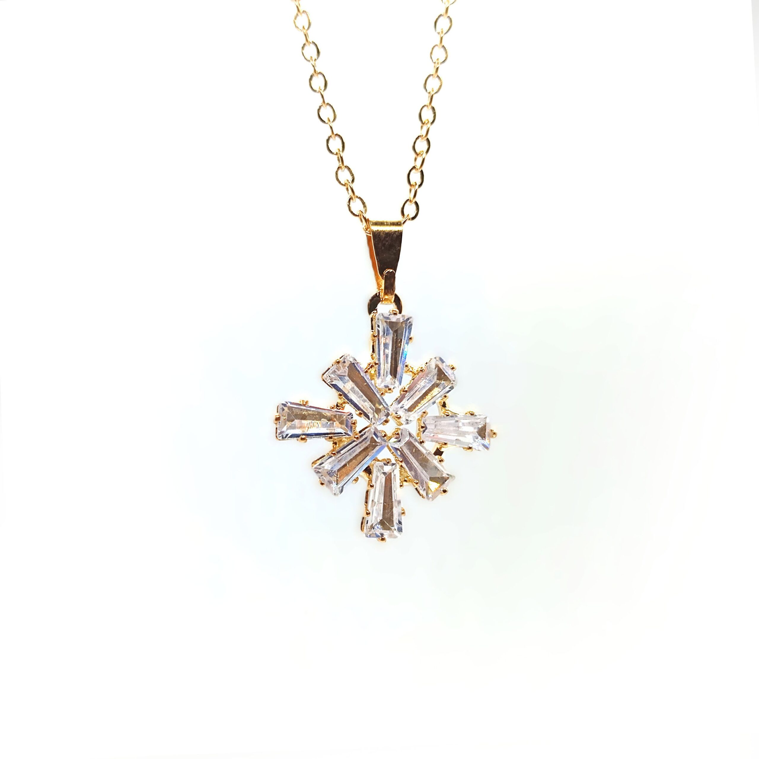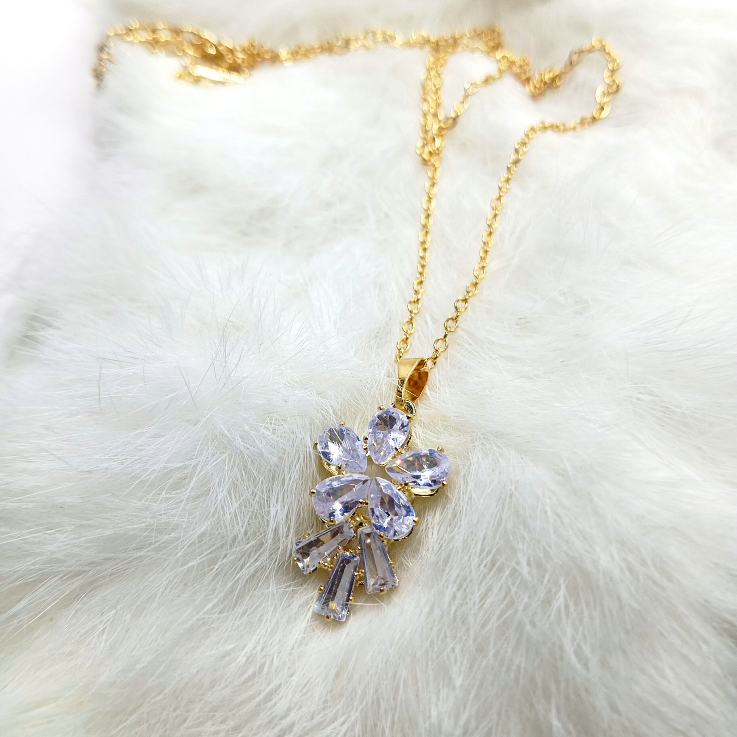 Elevate your style with this delicate gold necklace featuring a crystal flower pendant. The pendant showcases clear, baguette-cut crystals arranged in a blossom design, adding a touch of sparkle to any outfit.