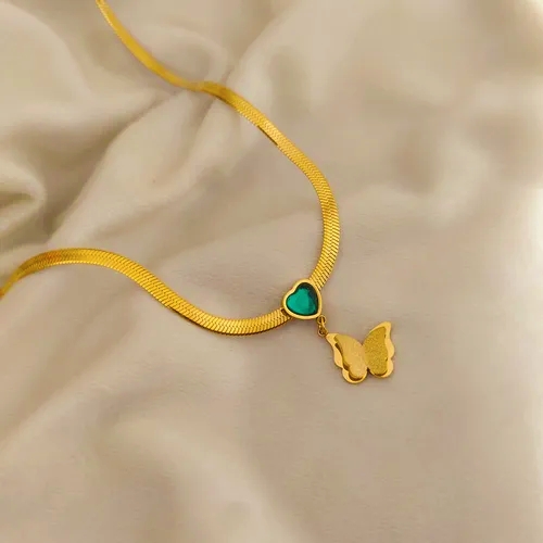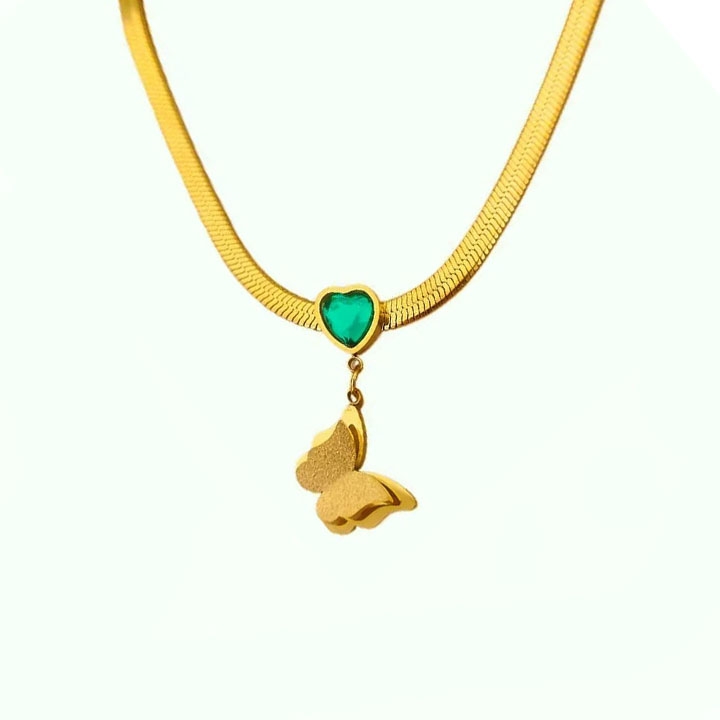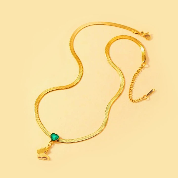 A delicate gold necklace featuring a heart-shaped emerald green gemstone and a charming butterfly pendant. The necklace is crafted with a textured gold chain, adding a touch of elegance to the overall design.