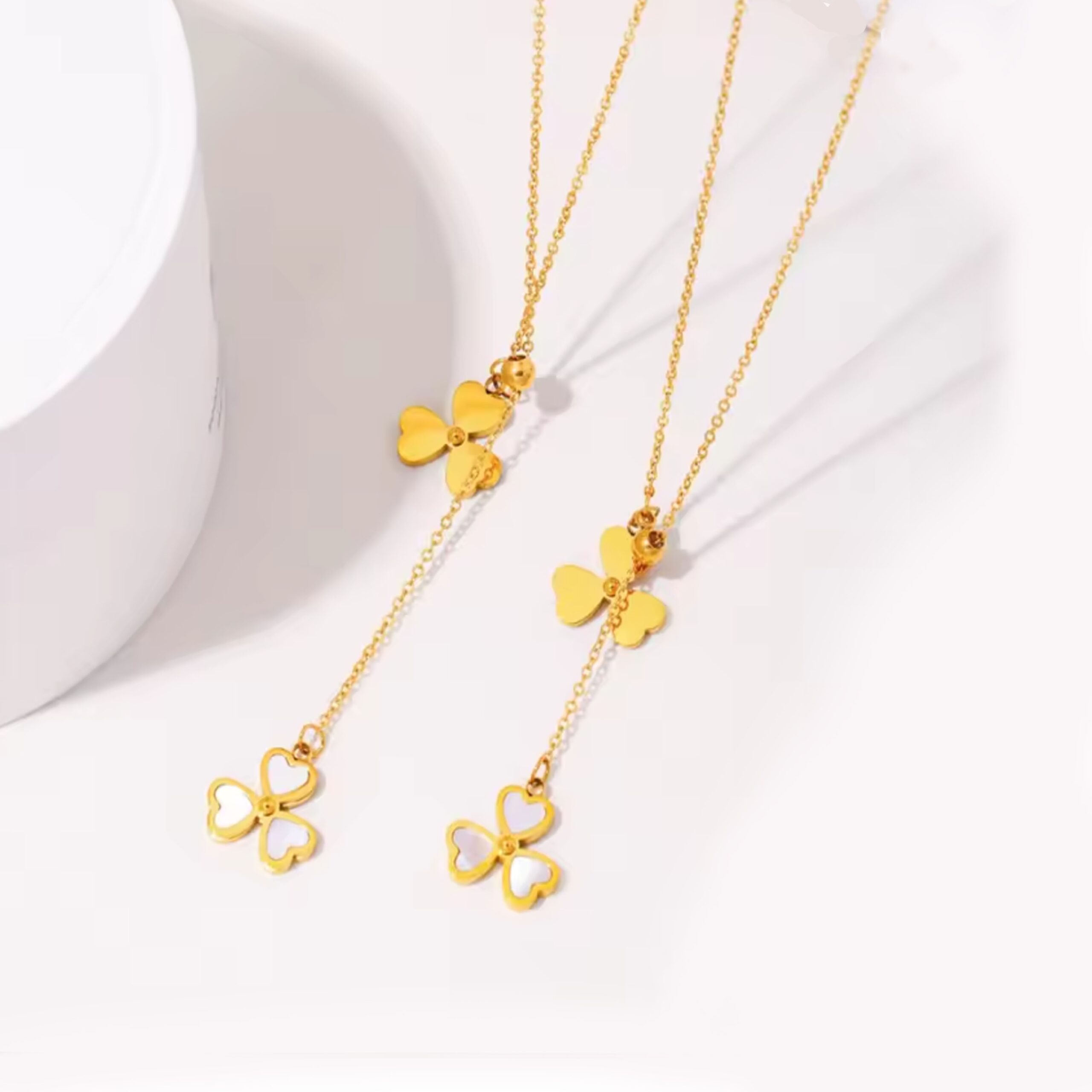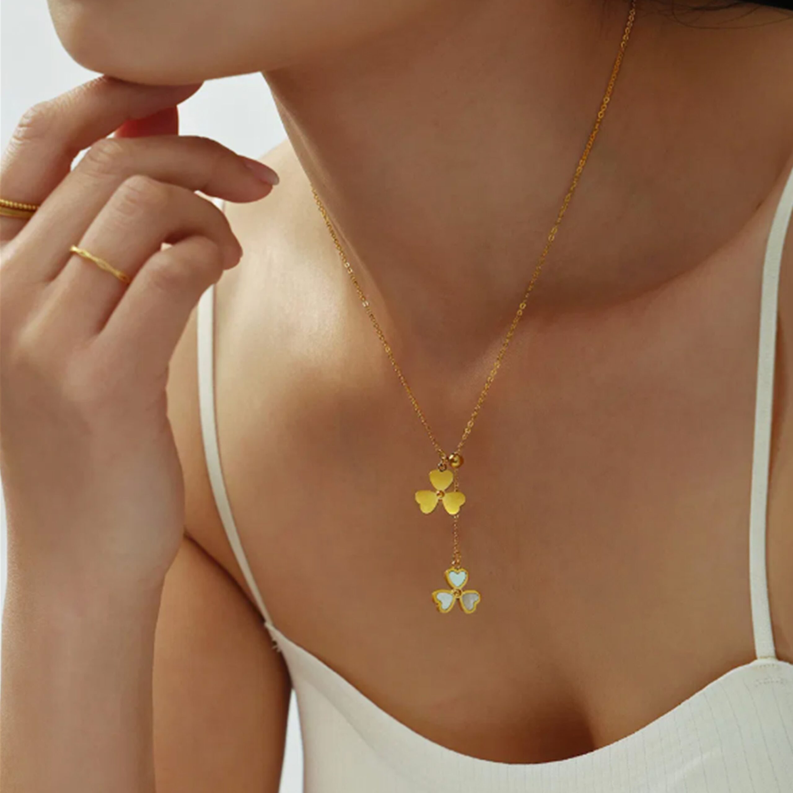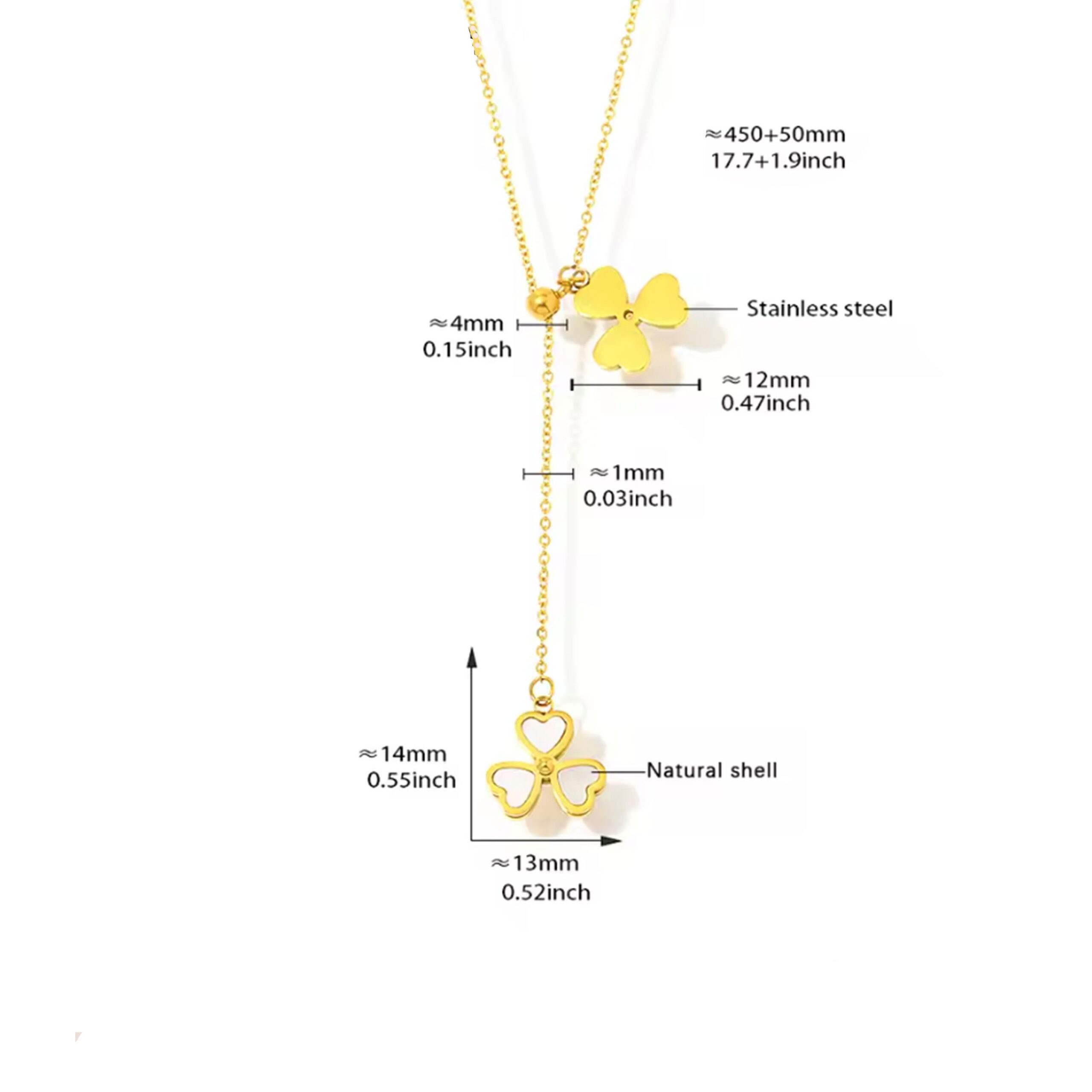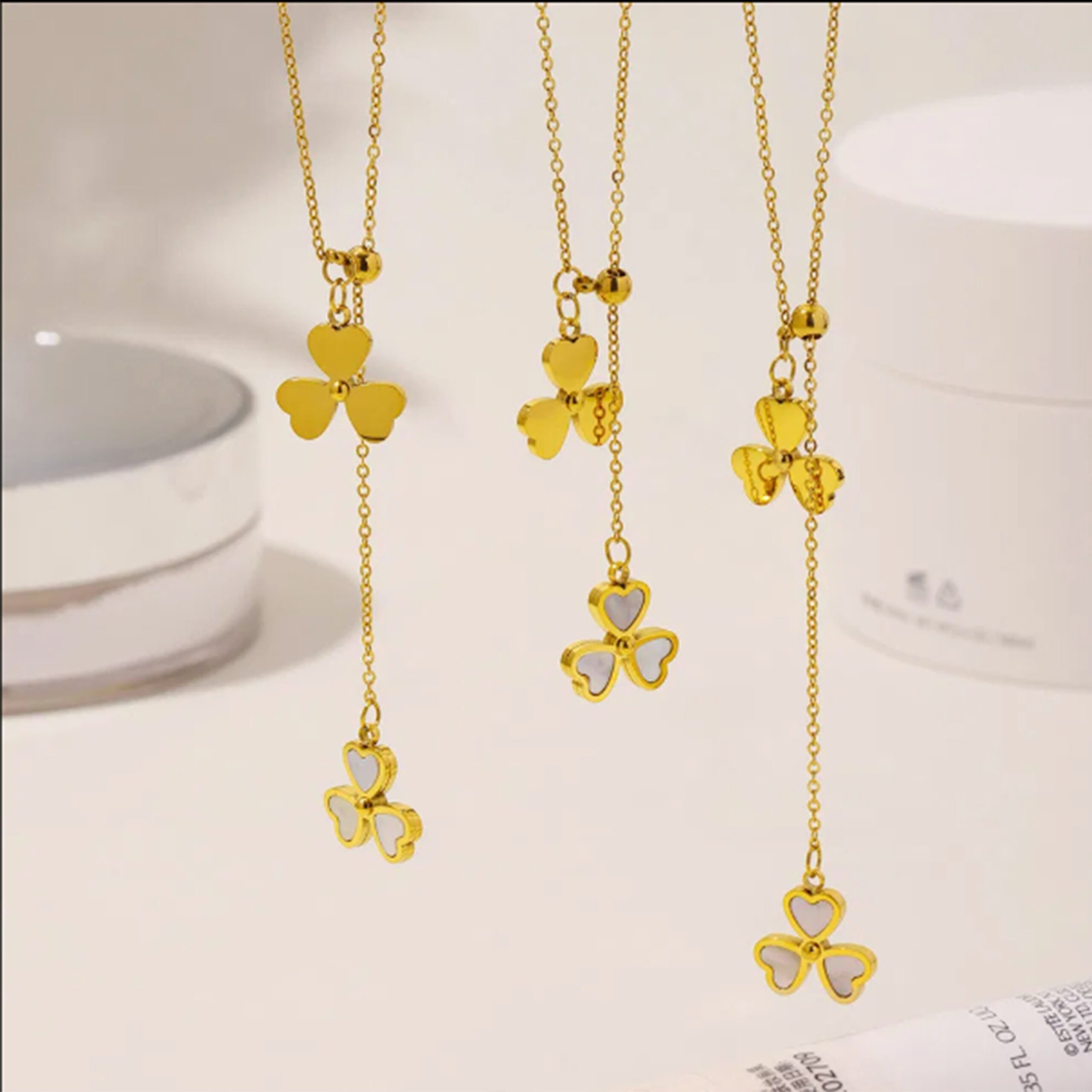 Simple, fashionable and individual design, stainless steel gold-plated natural mother-of-pearl heart-shaped three-leaf flower pendant, pull-out adjustable…