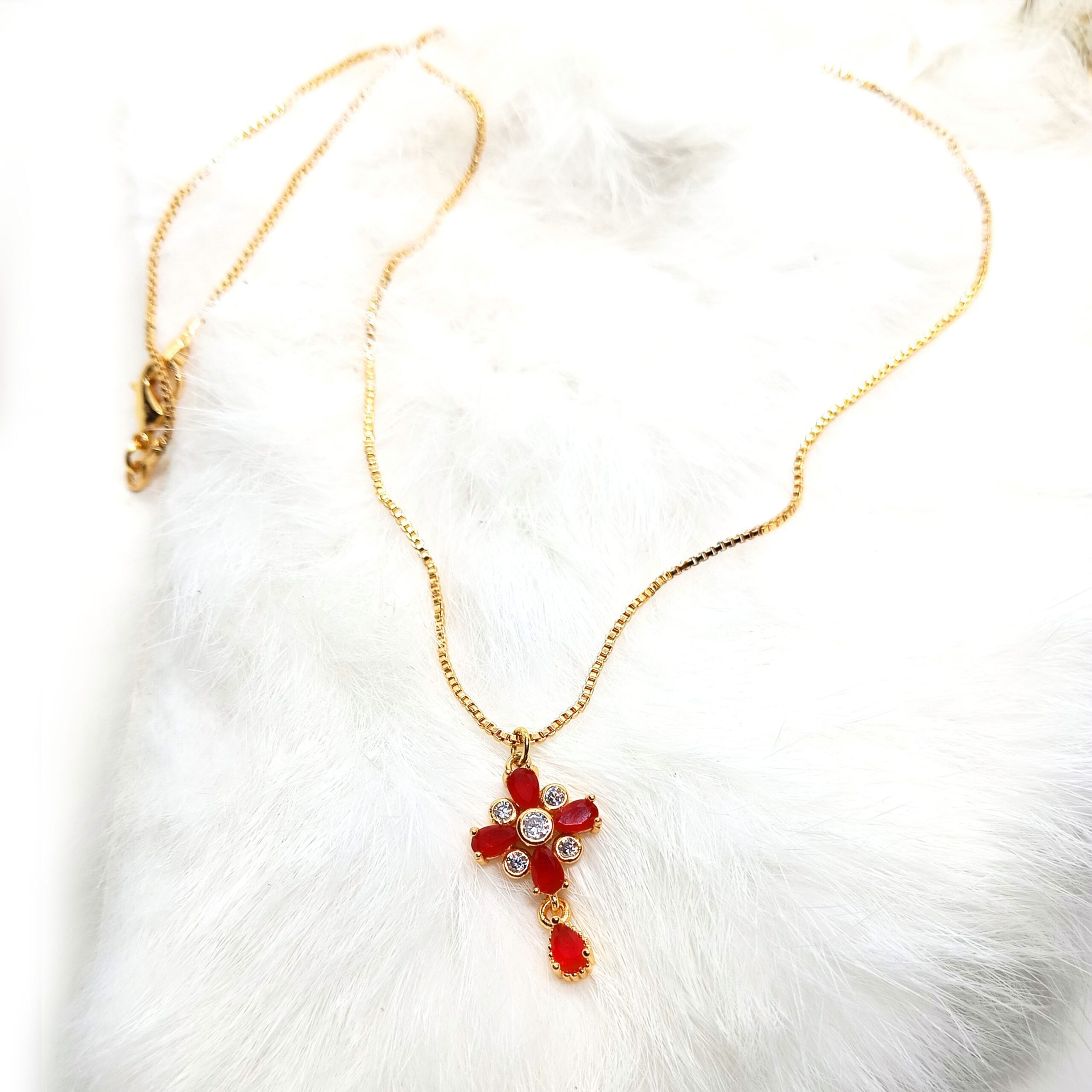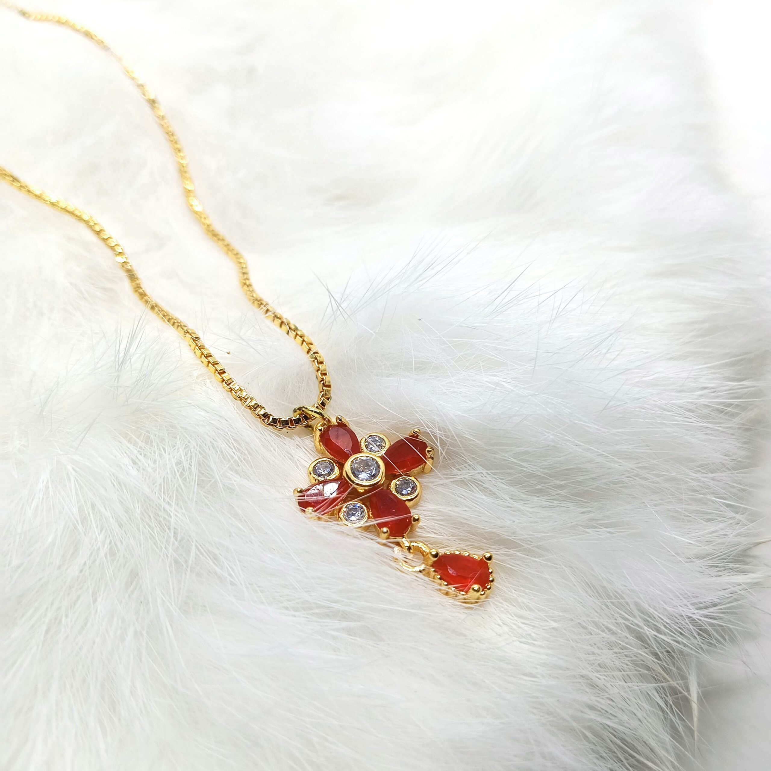 Elevate your style with the Rose Petal Charm Necklace, a delicate gold necklace featuring a charming flower-shaped pendant with red petals and clear gemstones. Perfect for adding a touch of elegance and sophistication to any outfit, this necklace is ideal for everyday wear or special occasions.